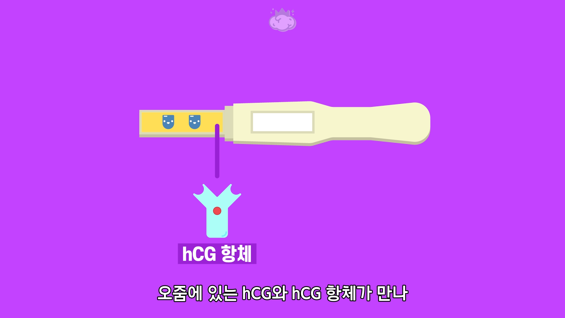 오줌에 있는 hCG와 임신테스트기에 있는 hCG 항체가 만나게 됩니다