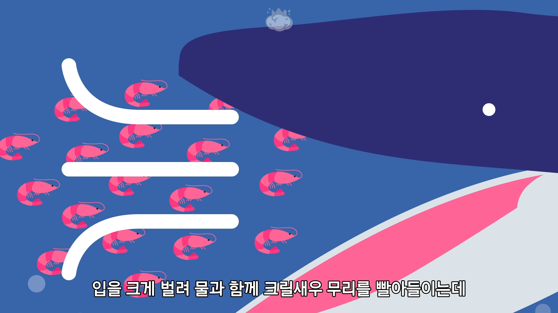 입을 크게 벌려 물과 함께 크릴새우 무리를 빨아들이는데